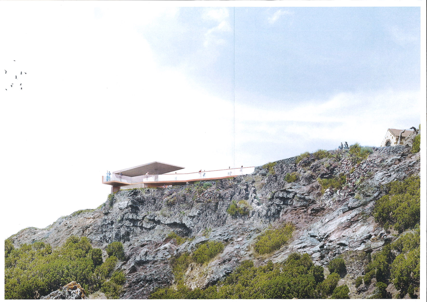 La propuesta para Jinama recupera la apertura del frente, sustituyendo los muros los actuales de piedra por otros de cristal, adentrándose en la caída del risco con una pasarela también acristalada.